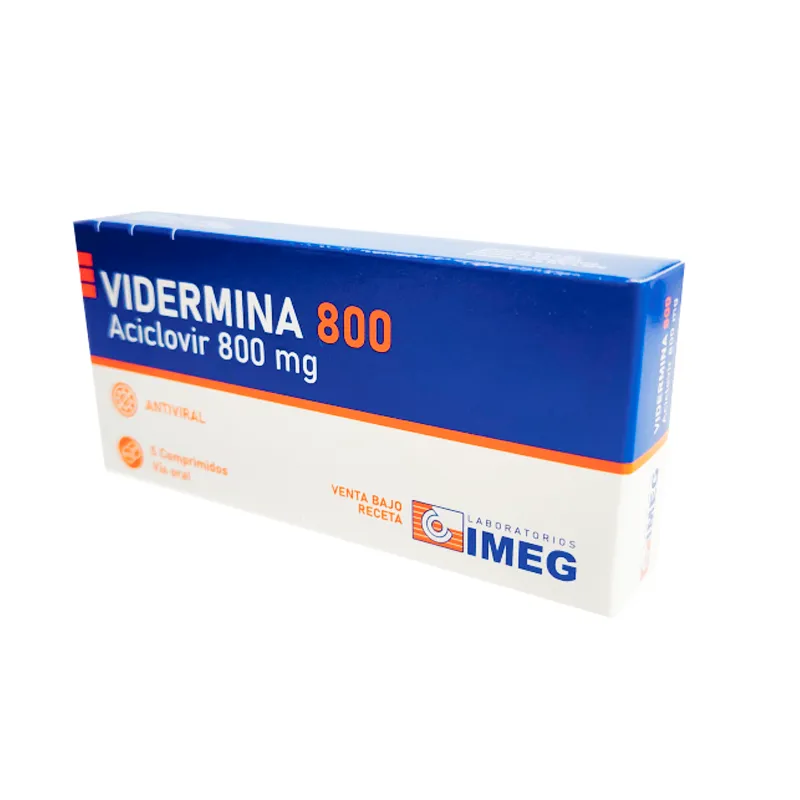 Descripción del Producto: Actua contra los tipos I Y II de herpes simples y virus de varicela zoster, con baja toxicidad para las células infectadas del hombre. Beneficios del Producto: Vidermina 800 esta indicado en le herpes zoster y genital recurrente, profilaxis del paciente inmunocomprometidos. Modo de Uso: Herpes zoster cada 4 horas, 5 veces al dìa 4 g diarios por un periodo de 7 al 10 dìas. Herpes genital un al dìa por 2 meses.