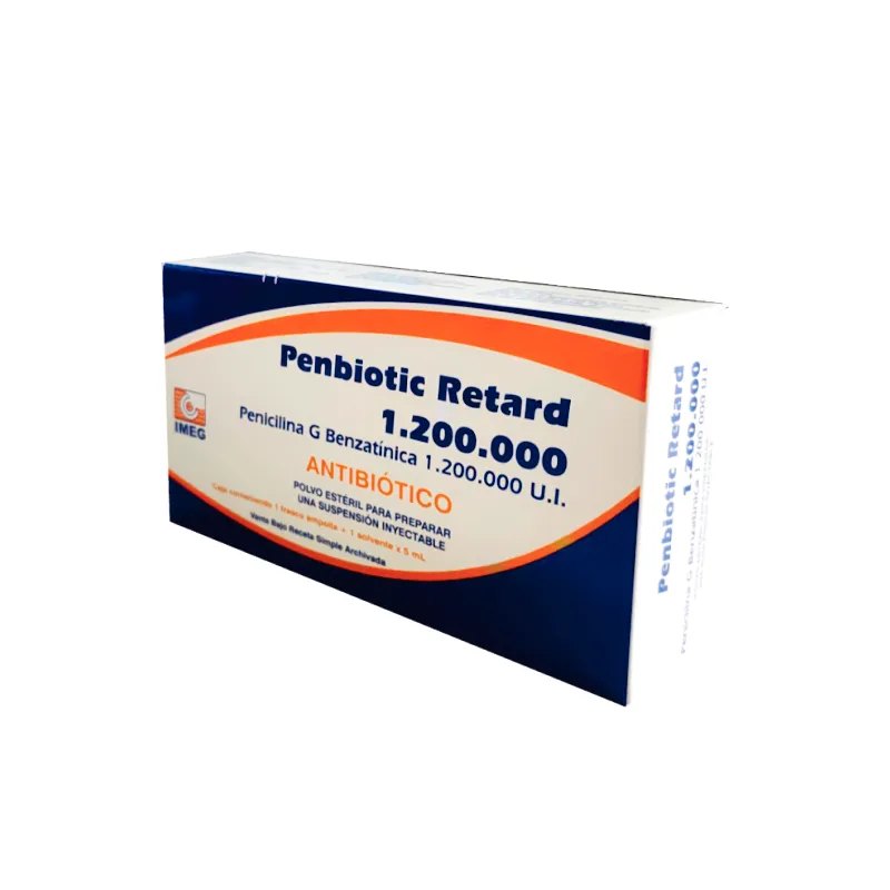 Descripción del Producto: Penbiotic Retard, es un antibiótico natural, betalactámico, bactericida, con acción a nivel de la pared bacteriana. La penicilina G. Benzatínica es principalmente activa contra los cocos Gram (+), como estreptococos meningococo, neumococo, etc., actuando también contra microorganismos Gram (-) como ser la Neisseria y algunos anaerobios. Beneficios del Producto: Penbiotic Retard, está indicado en todas las afecciones que requieren terapia penicilínica en dosis prolongadas, como tratamiento en los estados crónicos de gonorrea, sífilis, fiebre reúmatica, amigdalitis, faringitis, etc.Además está indicado como profiláctico de infecciones secundarias, como amigdalectomías, cirugía bucal, endocarditis, piodermitis y erisipela a repetición. Modo de Uso: Penbiotic Retard, es de uso exclusivamente intramuscular .No debe ser utilizado por vía endovenosa, ni intratecal.