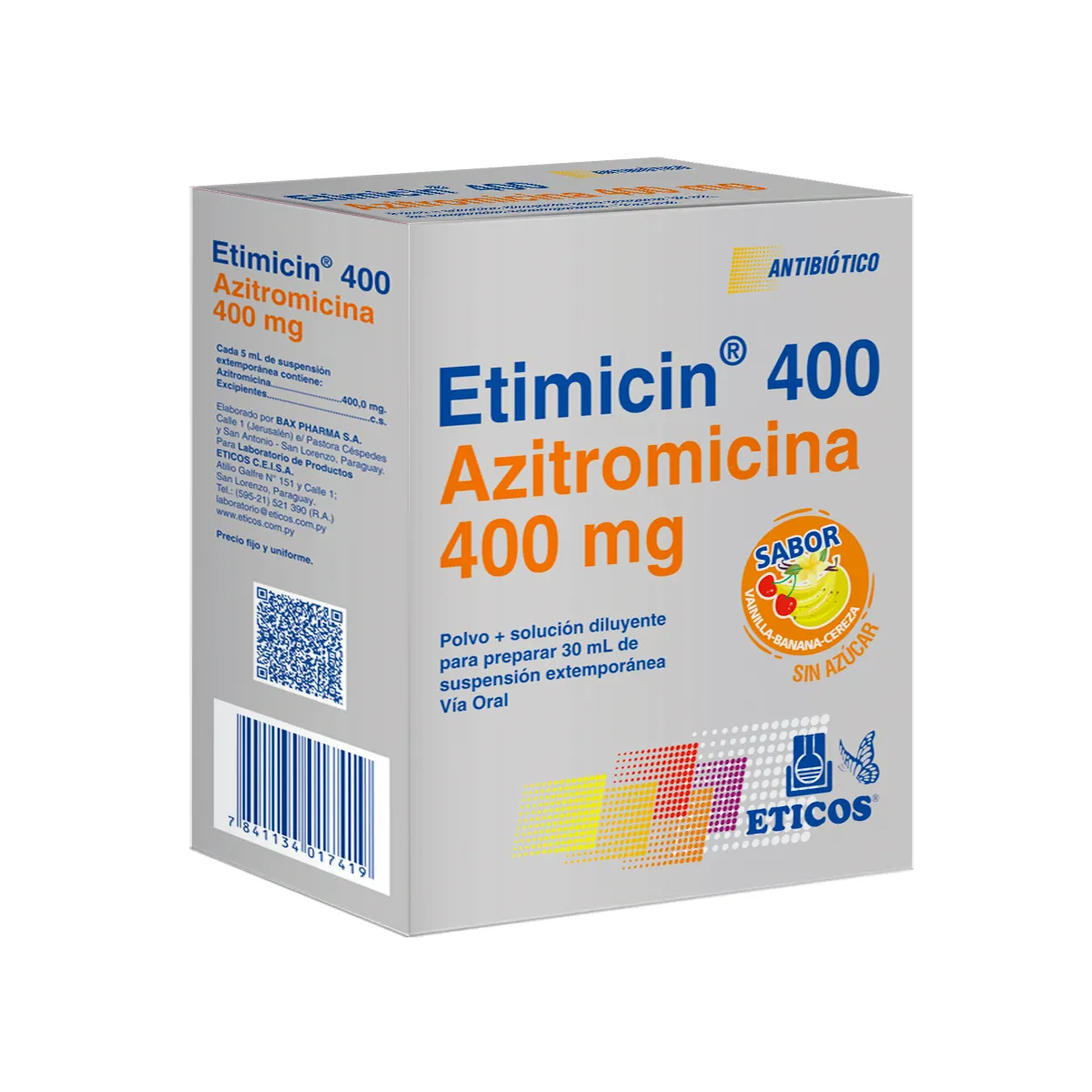 Acción Terapéutica: Antibiotico. Indicaciones: - Tratamiento de infecciones causadas por cepas susceptibles de los microorganismos enumerados en las condiciones específicas. - Tracto respiratorio inferior:bronquitis. Exacerbaciones bacterianas agudas de enfermedad pulmonar obstructiva crónica debidas a Haemophilus influenzae, Moraxella catarrhaliso Streptococcus pneumoniae. - Neumonía adquirida en la comunidad causada por Streptococcus pneumoniaeo Haemophilus influenzaeen pacientes adecuados para el tratamiento oral ambulatorio. - Neumonía causada por Mycoplasma pneumoniae. - Tracto respiratorio superior:faringitis o amigdalitis por Streptococcus pyogenes. - En nasofaringitis es efectivo en la erradicación de las cepas susceptibles de Streptococcus pyogenes. - Piel y estructura de la piel: infecciones no complicadas de la piel y de la estructura de la piel causadas por Staphylococcus aureus, Streptococcus pyogeneso Streptococcus agalactiae. - Los abscesos generalmente requieren un drenaje quirúrgico asociado con el tratamiento. - Enfermedades transmitidas sexualmente:uretritis no gonocócica y cervicitis causadas por Chlamydia trachomatis. Posología: La dosis será establecida por el médico en función de las necesidades individuales y el tipo de infección: ETIMICIN 400 MG: Cada 5 ml de suspensión contiene 400mg de Azitromicina. Niños con peso >15 kg: 10 mg/kg/dia, administrado en una sola toma, durante 3 días consecutivos. Como alternativa la misma dosis total puede ser administrada durante 5 días, administrando 10mg/kg el primer dia, para continuar con 5mg/kg/dia durante los cuatro dias restantes. Contraindicaciones: Hipersensibilidad conocida a la azitromicina, eritromicina u otro antibiótico macrólido. Niños menores de 6 meses. Reacciones Adversas: La mayoría de las reacciones adversas registradas en los ensayos clínicos fueron de naturaleza leve a moderada y reversibles tras la interrupción del tratamiento. Aproximadamente el 0,7% de los pacientes incluidos en los ensayos clínicos, bajo un régimen posológico de 5 días de duración, interrumpieron el tratamiento debido a reacciones adversas. La mayor parte de estas estaban relacionadas con el sistema gastrointestinal, y consistieron en náuseas, vómitos, diarrea o dolor abdominal.