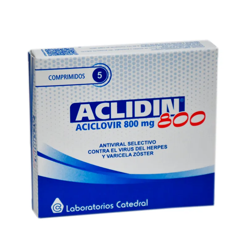 Aclidin 800, comprimidos Tratamiento de infecciones causadas por el virus herpes simple en la piel y membranas mucosas, incluyendo el herpes genital simple y recurrente. Tratamiento supresor (prevención de recurrencias) de infecciones recurrentes causadas por virus herpes simple en pacientes inmunocompetentes. Profilaxis de las infecciones causadas por virus herpes simple. En pacientes inmunocomprometidos (pacientes trasplantados, bajo tratamiento con quimioterápicos o infectados por VIH). Tratamiento de la varicela y herpes Zoster.