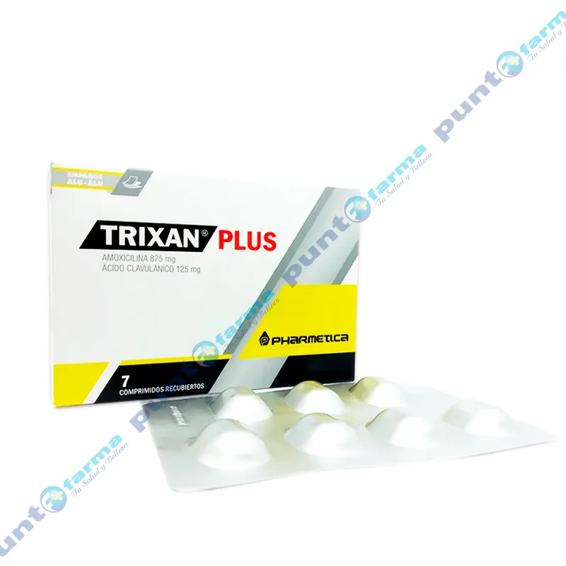 Indicaciones: Infecciones genitourinarias, infecciones de garganta, nariz y oídos (amigdalitis, otitis) infecciones respiratorias: bronquitis aguda y crónica. Infecciones de la piel y tejidos blandos. Posología: Dosificación normal para el tratamiento de infecciones: Adultos y niños mayores de 12 años: Un comprimido de TRIXAN PLUS dos veces por día. No se recomienda administrar TRIXAN PLUS Comprimidos en niños menores de 12 años. Dosificación en casos de insuficiencia renal: Insuficiencia leve (Clearance de creatinina >30 ml/min) Insuficiencia moderada (Clearance de creatinina 10 – 30 ml/min) Insuficiencia grave (Clearance de creatinina <10 ml/min) Ningún cambio en la dosificación: 1 comprimido cada 12 horas. Contraindicaciones: Está contraindicado en pacientes con hipersensibilidad a la penicilina. Se recomienda considerar una posible sensibilidad cruzada con otros antibióticos ß -lactámicos, como las cefalosporinas. Antecedentes de ictericia o insuficiencia hepática asociada con la administración de penicilinas o de TRIXAN PLUS.