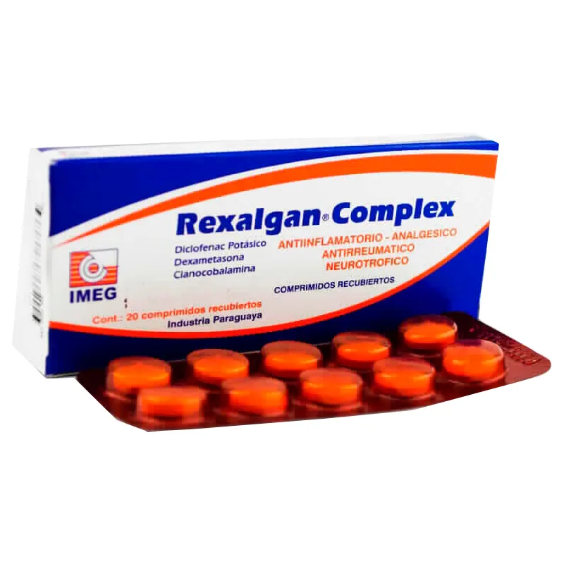 Rexalgan Complex es una potente asociación de diclofenac potásico, dexametasona y cianocobalamina consiguiendo así una marcada acción antiinflamatoria, antirreumática, antipirética y neurotrófica. Rexalgan Complex inhibe la síntesis de las prostaglandinas y relaja la musculatura lisa por medio del diclofenac potásico. Gracias a la dexametasona, droga antiinflamatoria por excelencia, suprime el edema inflamatorio e inhibe la formación de los fibroblastos. Inhibe el dolor, rubor, calor y la inflamación de los procesos artríticos y reumáticos, intra y extraarticulares. La cianocobalamina (vitamina B12) es una droga con marcada acción neurotrófica, interviniendo en la síntesis de la mielina, lipoproteína indispensable para la integridad del sistema nervioso.