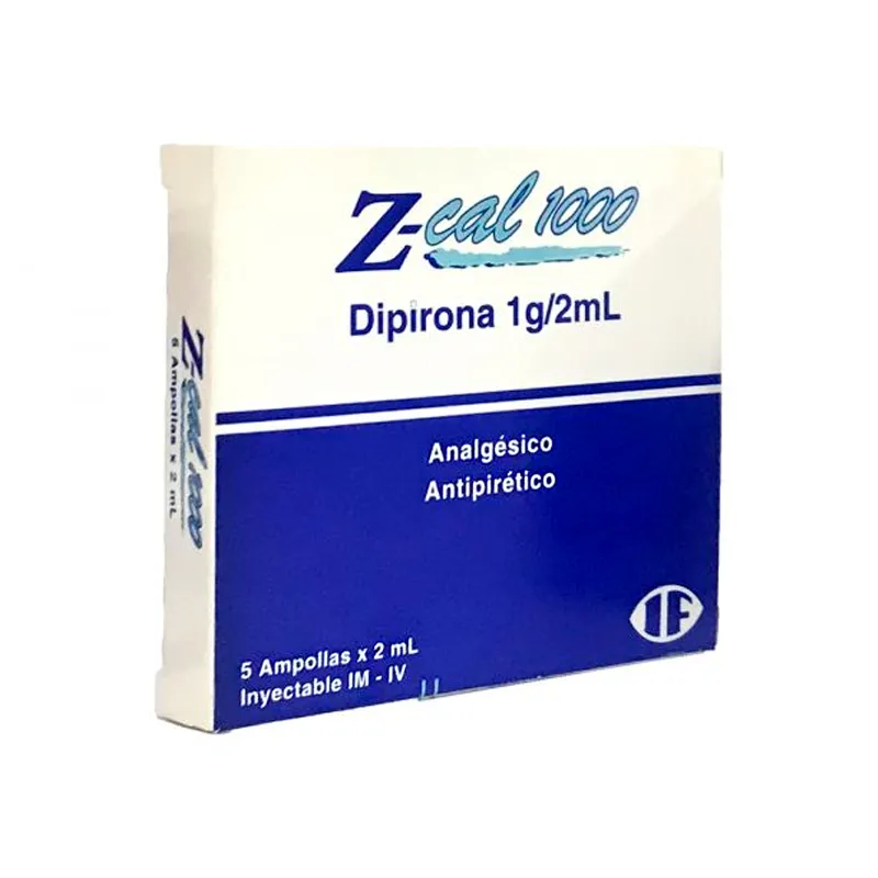 Acción Terapéutica: Z-CAL 1000 proporciona acción analgésica, antipirética y antiinflamatoria. Es un derivado pirazolónico que actúa selectivamente sobre el Tálamo, disminuyendo la reactividad de los centros nerviosos frente a los excitantes termógeno-dolorosos. Indicaciones: Está indicado para el tratamiento sintomático de los cuadros clínicos dolorosos que cursan con o sin fiebre, cefaleas, jaquecas, odontalgias, neuralgias, neuritis ciática, lumbalgias. Dolores post-traumáticos y post-quirúrgicos, cólicos biliares, uterinos, ureterales y vesicales. Contraindicaciones: Hipersensibilidad a las pirazolonas. Anemia aplásica o agranulocitosis de causa tóxico-alérgica. Pacientes con historia de asma inducido por ácido acetilsalicílico o intolerancia conocida a los analgésicos, del tipo urticaria-angioedema, broncoespasmo. Deficiencia de glucosa-6-fosfato deshidrogenasa y porfiria hepática. Síndrome hemorrágico. Ulceras pépticas. Insuficiencia renal o hepática grave. En caso de estar recibiendo tratamiento citostatico, debe restringirse a casos estrictamente necesarios. Tampoco se recomienda en el ultimo trimestre del embarazo. Pacientes con hipersensibilidad al principio activo o algunos de los excipientes de la formula. Reacciones Adversas: La reacción adversa más frecuente es dolor en el lugar de la inyección, seguida de sensación de calor y sudoración. Si laadministración intravenosa se realiza muy rápidamente puede presentarse sensación de calor, rubor, palpitaciones e incluso náuseas. Reacciones de hipersensibilidad que pueden llegar a producir trastornos hemáticos por mecanismos inmunes, tales como agranulocitosis, anemia aplásica, leucopenia. Shock tóxicoalérgico. Reacciones alérgicas cutáneas como prurito, rash,urticaria-angioedema, eritema y shock anafiláctico. Hipotensión. Broncoespasmo. Arritmias cardiacas.