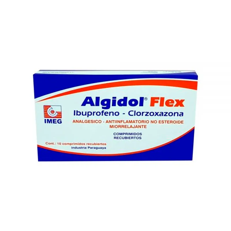 Descripción del Producto: Algidol Flex es un medicamento de acción combinada diseñado para aliviar el dolor moderado a intenso asociado con espasmos musculares. Gracias a su doble fórmula, ataca la raíz del malestar desde dos frentes: Ibuprofeno: Actúa como un potente Antiinflamatorio No Esteroideo (AINE) y Analgésico, reduciendo la inflamación, el dolor y la fiebre. Clorzoxazona: Es un eficaz Miorrelajante de acción central que ayuda a relajar la musculatura esquelética, aliviando la tensión y los calambres. Indicaciones Terapéuticas Algidol Flex está especialmente indicado para el tratamiento sintomático de dolores y calambres de la musculatura esquelética, tales como: Contracturas musculares y espasmos dolorosos. Dolores de cuello (tortícolis) y espalda (lumbago). Lesiones traumáticas de los músculos, como esguinces y luxaciones. Mialgias (dolores musculares) en general. Cefaleas tensionales causadas por rigidez en los músculos del cuello y hombros. Molestias asociadas a espondiloartrosis y síndrome cervical.
