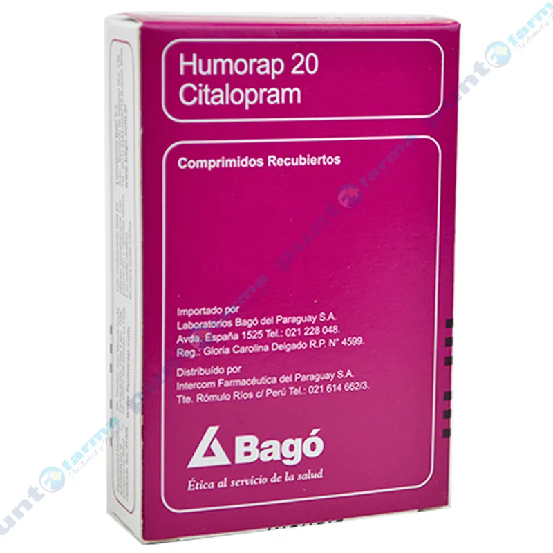 Tratamiento de la depresión. En pacientes ambulatorios cuyo diagnóstico correspondía a la categoría de trastornos depresivos mayores del DSM-III y DSM-III-R. Dosificación: La dosis se adaptará según el criterio médico al cuadro clínico del paciente. Como posología media de orientación, se aconseja: iniciar el tratamiento con una dosis inicial de 20mg una vez al día, la que puede incrementarse hasta 40mg/día. El incremento de la dosis se realiza generalmente de a 20mg en intervalos no menores a una semana. HUMORAP puede ser administrado una vez al día, por la mañana o tarde, junto o alejado de las comidas. Contraindicaciones: Está contraindicado el uso concomitante en pacientes que estén recibiendo un tratamiento con IMAO. Está contraindicado en pacientes con hipersensibilidad al citalopram o a alguno de los componentes de la formulación.