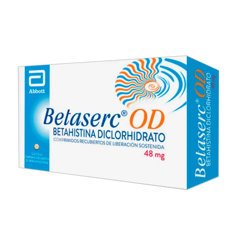 Acción Terapéutica: Antivertiginoso. Indicaciones: Está indicado para síndrome de ménière según lo definido por la siguiente tríada de síntomas principales: vértigo (con náuseas / vómitos), pérdida auditiva (dureza de la audición) tinnitus, tratamiento sintomático del vértigo vestibular. Posología: Siempre tome betasercod 48 mg exactamente como su médico le ha señalado. Usted debe consultar con su médico o doctor si no está seguro de cómo tomar o usar betaserc od 48 mg. El médico debe indicar la posología y el tiempo de tratamiento apropiados a su caso particular, no obstante, la dosis usual recomendada es: 1 comprimido recubierto una vez al día. Método de administración: este medicamento debe administrarse por vía oral con un vaso de agua. Contraindicaciones: Hipersensibilidad al ingrediente activo o a cualquiera de los excipientes. Feocromocitoma. Reacciones Adversas: No se han realizado estudios de interacción in vivo. Con base en los datos in vitro, no se espera inhibición in vivo de las enzimas del Citocromo P450. Los datos in vitro indican una inhibición del metabolismo de la betahistina por los medicamentos que inhiben la monoamino-oxidasa (MAO) incluido el subtipo B de MAO (por ejemplo, Selegilina). Se recomienda precaución cuando se utilizan concomitantemente betahistina e inhibidores de la mao (incluidos los inhibidores selectivos de la mao-b). Como la betahistina es un análogo de la histamina, la interacción de la betahistina con los antihistamínicos puede en teoría afectar la eficacia de algunos de estos medicamentos. Por favor, dígale a su médico o doctor si está tomando o ha tomado recientemente cualquier otro medicamento, incluso los adquiridos sin prescripción. Precauciones y Advertencias: Los pacientes con asma bronquial y antecedentes de úlcera péptica deben monitorearse cuidadosamente durante el tratamiento.