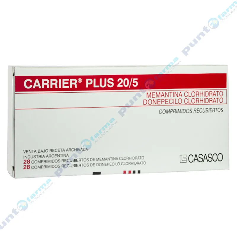 Indicaciones Tratamiento de la demencia tipo Alzheimer grado moderado a severo. En pacientes con tratamiento ya establecido a base de la monoterapia con donepecilo ó memantina y se pretenda asociarlas. Posología Carrier plus no constituye un tratamiento de inicio. La dosis diaria recomendada es de un comprimido de memantina 20 mg más un comprimido de donepecilo de 5 ó 10 mg. Se recomienda administrar memantina por la mañana y donepecilo por la noche antes de acostarse. En los pacientes ya tratados con dosis plena de memantina 20 mg/día, se aconseja iniciar con CARRIER PLUS 20/5 para luego titular según respuesta a CARRIER PLUS 20/10. La dosis plena de memantina 20 mg/día se debe alcanzar de acuerdo al siguiente esquema: 1° semana: 5 mg una vez por día durante 7 días 2° semana: 10 mg una vez por día durante 7 días 3° semana: 15 mg una vez por día durante 7 días A partir de la 4° semana: 20 mg una vez por día. Los pacientes ya tratados con donepecilo 5 ó 10 mg/día, deben iniciar el escalonamiento habitual de la dosis de memantina hasta los 20 mg/día. En este momento puede emplearse CARRIER PLUS 20/5 ó CARRIER PLUS 20/10. Contraindicaciones Hipersensibilidad conocida a los principios activos, estados confusionales graves, alteración severa de la función renal o hepática, embarazo y lactancia.