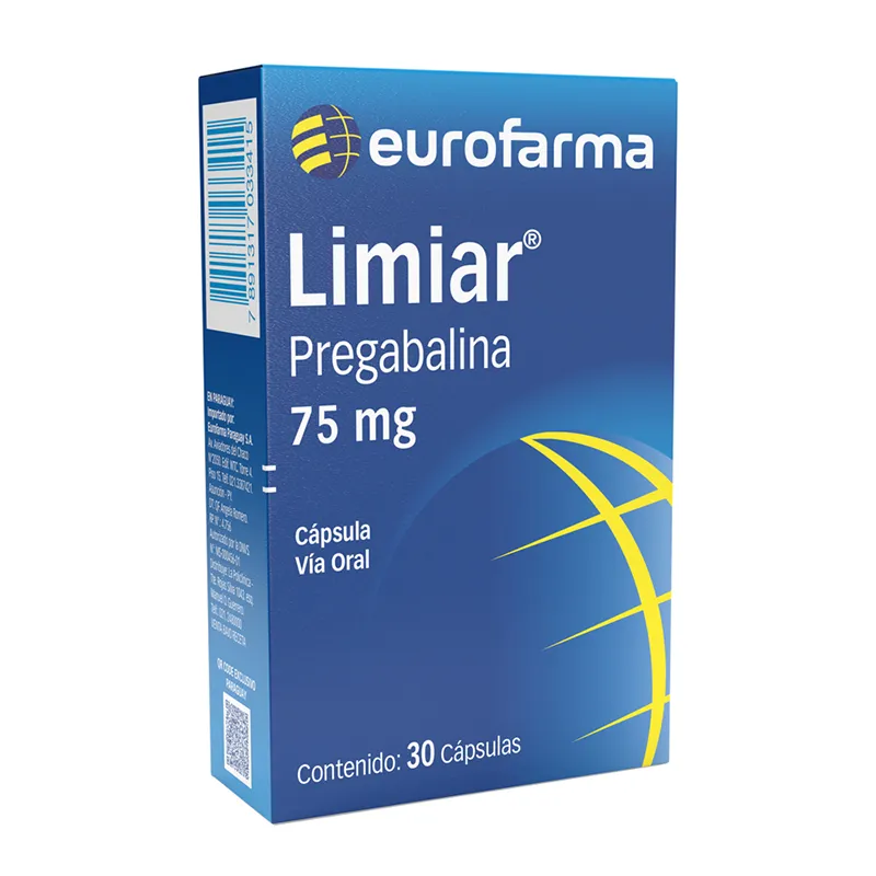 Descripción del Producto: Limiar es pregabalina [ácido (S)-3-(aminometil)-5-metilhexanoico], un análogo del ácido gamma-aminobutírico (GABA). Su uso está aprobado en el tratamiento del dolor neuropático periférico y central en el adulto (incluida la neuropatía diabética y en la neuralgia postherpética). También está indicado en el tratamiento adyuvante en adultos con convulsiones parciales con o sin generalización y en el tratamiento de fibromialgias. Beneficios del Producto: Producto Bioequivalente Primera Línea de Tratamiento – Recomendado por las principales guías internacionales por la eficacia y seguridad que brinda en el alivio del dolor central y periférico Eficaz y sostenido alivio – Ofrece pronta mejoría desde la primara semana y se mantiene durante el tratamiento Adecuado perfil de seguridad – Baja incidencia de efectos adversos con baja interacción con otros fármacos También alivia los síntomas de Ansiedad Generalizada - Ofrece mejoría global en la calidad de vida.. Modo de Uso: 2 comprimidos al día o a criterio médico.