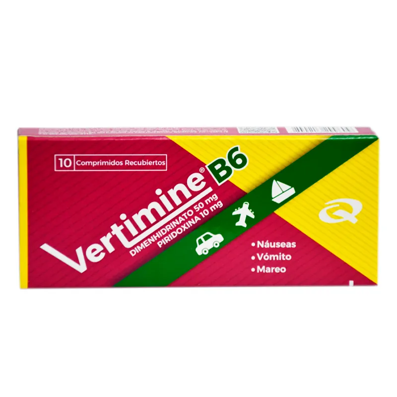 Acción Terapéutica: Antiémetico. Indicaciones Terapéuticas: Profilaxis y tratamiento de las nauseas y los vómitos en general, entre los cuales Nauseas y vomitos en el embarazo Nauseas, vómitos y mareos provocados por la cinetosis (mareo por movimiento) Nauseas y vómitos después del tratamiento de radioterapia y en los periodos pre y postoperatorios, incluidos los vómitos después de la cirugia del tracto gastrointestinal En el control profiláctico y la terapia de crisis aguda de los trastomos de la función vestibular ylo del vertigo, de ongen central o periférico, incluida la laberintitis Contraindicaciones: Hipersensibilidad conocida a los componentes de la formula El dimenhidninato está contraindicado en pacientes porfiricos Vertimine B6 está contraindicado en niños menores de 12 años Posología: Adultos mayores de 12 años: 1 a 2 comprimidos (50 a 100 mg de dimenhidrinato), cada 4 horas, sin superar los 400 mg de dimenhidrinato en 24 horas. La dosis diaria máxima recomendada es de 400 mg para adultos mayores de 12 años Cuando se viaja, Vertimine 86 debe utilizarse de forma preventiva, al menos con media hora de antelación. En caso de insuficiencia hepática: debe considerarse la reducción de la dosis en pacientes con insuficiencia hepática aguda, ya que el dimenhidrinato es intensamente metabolizado por el higado. Modo de uso Vertimine B6 puede tomarse inmediatamente antes o durante las comidas. Debe ingerirse con una cantidad suficiente de agua. Este medicamento no debe romperse, abrirse ni masticarse.
